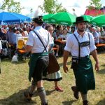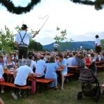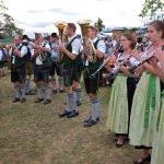 Diese hatten bereits im Vorfeld aus einer unberührten Wiese einen gemütlichen Festplatz gezaubert und bewirteten aus dem geräumigen Küchenhaus und den Hütten für Kaffee, Kuchen, Radi und Bargetränken ihre Besucher mit regionalen Schmankerln und den Getränken der beiden Siegsdorfer Mineralbrunnen Adelholzener Alpenquellen und Siegsdorfer Petrusquelle. Auch das süffige Bier der Brauerei Schnitzelbaumer aus Traunstein, die ebenfalls seit über 50 Jahren bestens mit den Trachtlern zusammenarbeitet, fand wieder reißenden Absatz. Schmackhaftes Bauernhof-Eis vom Lindlhof in Nußdorf und zwei große Hüpfburgen der Familie Gstatter aus Siegsdorf rundeten das umfassende Angebot ab. Die Musikkapelle Vogling-Siegsdorf sorgte in zwei Schichten für die musikalische Umrahmung des Festes und begleitete die Siegsdorfer Trachtenjugend bei ihren Tänzen und Plattlern, und zum Sonnenuntergang ließen sich auch die Siegsdorfer Goaßlschnalzer hören und sehen. Die gute Stimmung unter den Helferinnen und Helfern sorgte trotz des starken Andranges für einen reibungslosen Ablauf und als zur Dämmerung die Musikanten zum traditionellen „Vergelts Gott – Standerl“ vor die Küche kamen, schlug bei vielen der jüngeren Helferinnen und Helfer der anstrengende Tag in euphorische Feierlaune um, die dann auch gründlich ausgelebt werden durfte.