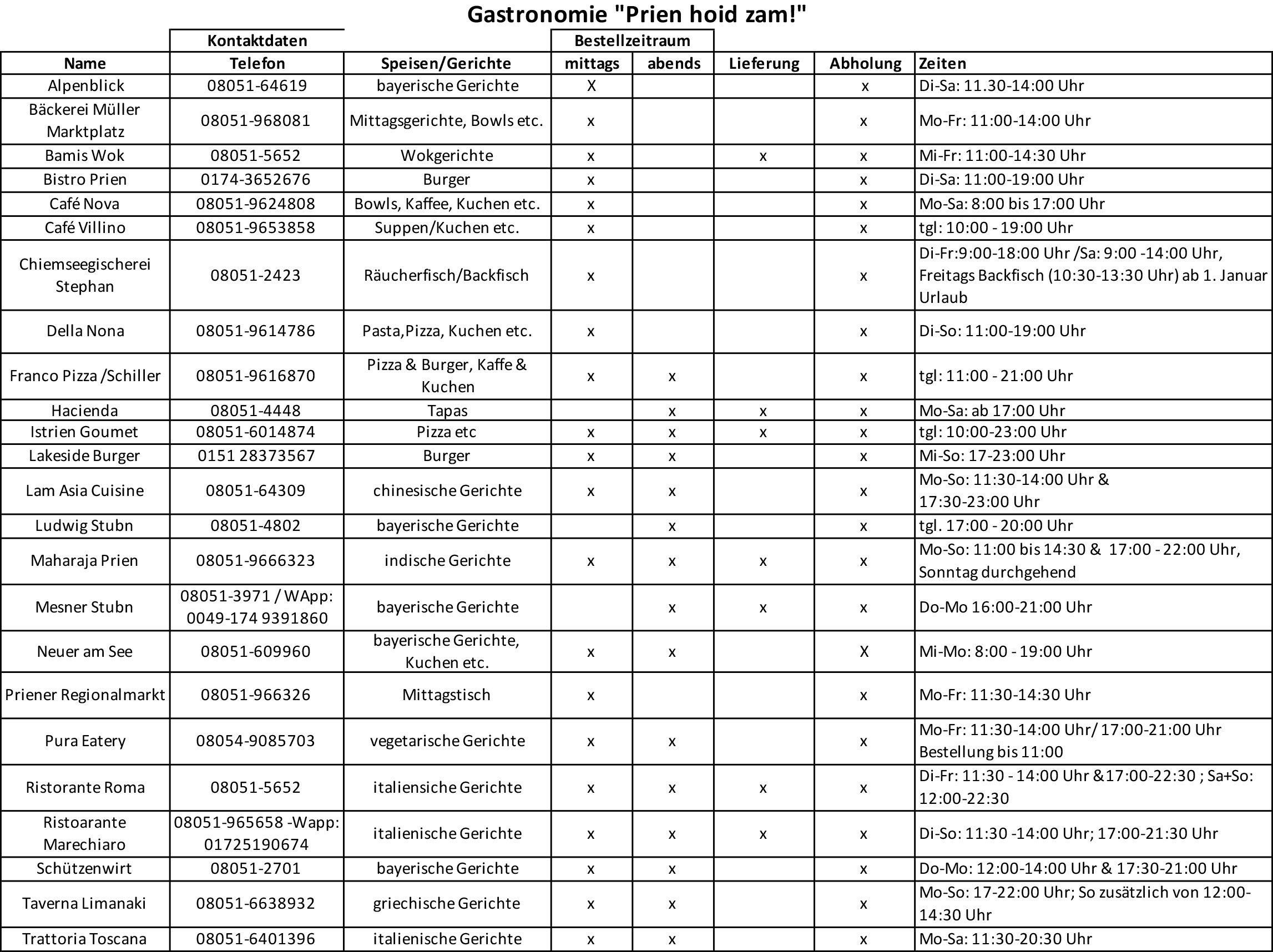 So bunt und reichhaltig, wie in der Marktgemeinde Prien das gastronomische Sortiment vor der Corona-Krise war, so interessant und abwechslungsreich ist es auch jetzt während der Zeit des Lockdowns und der Weihnachtsfeiertage im To-Go- bzw. Abhol-Modus. In guter Koordination zwischen dem Gewerbeverbund “PrienPartner”, der Prien Marketing GmbH (PriMa) und den gastronomischen Betrieben konnte für die Weihnachtsfeiertage eine Übersicht erstellt werden, welche Häuser zu welchen Zeiten welche Speisen und Gerichte anbieten. Diese Übersicht anbei.