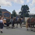 Nach dem Gottesdienst folgte der Festzug, wegen der großen Anzahl an Teilnehmern auf zwei Züge aufgeteilt, die in unterschiedlichen Richtungen durch die blau-weiß geschmückten Strassen des Ortes marschierten ehe sie an der Ehrentribühne vorbei zweizügig ins Festzelt zogen. Tausende Zuschauer säumten die Straßen, um das farbenprächtige Bild zu bewundern, das die von jeweils zwei Vorreitern angeführten Züge mit den drei Ehrenkutschen, den vierzehn Gespannen, 46 Musikkapellen und natürlich den vielen, vielen Trachtlern der 113 teilnehmenden Vereine abgaben.