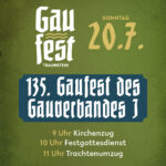 Am Samstag, den 19. Juli 2025 gehts traditionell mit dem Gauheimatabend weiter. Ab 20 Uhr erwartet euch an dem Abend ein abwechslungsreiches Programm mit Auftritten der Gruppen unserer Festvereine, der Gaujugendgruppe, der Gaugruppe, begleitet von unserer Festmusik der Stadtmusik Traunstein und vielen mehr. Anschließend lassen wir den Abend gemütlich an der Bar mir den Hallgrafen Musikanten ausklingen.