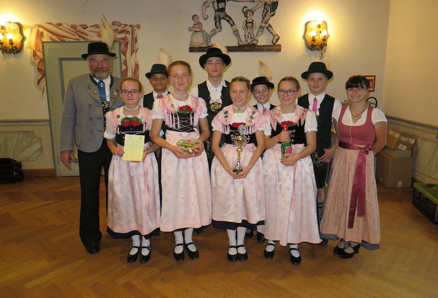GJDD Gruppe II von links nach rechts: 1. Gauvorstand Georg Schinnagl, Hochstätt (1., 187,6 Punkte), 1. Gaudirndlvertreterin Vroni Bauer