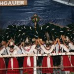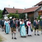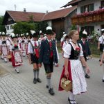 Angeführt von der Festkapelle marschierten viele Trachtlerinnen und Trachtler beim Kirchzug mit den Musikkapellen Buching und Trauchgau zum Moorlehrpfard. In Konzelebration mit den Pfarrern Gottfried Fellner, Alois Roßmanith, Wolfgang Schnabel, Pater Bruno und Pater Radek feierte Pater Adrianus den festlichen Gottesdienst. In seiner Predigt verglich er einen Fußballfan mit einem Trachtler und stellte fest, dass es das äußere Erscheinen Beider ist, das sie ausmacht. Die Tracht ist ein Bekenntnis zur Heimat und zu den Traditionen, die oft im Glauben begründet sind. Kleider machen Leute, das gilt für die Tracht und die Gläubigen. Die musikalische Gestaltung des Gottesdienstes übernahmen die Festkapelle und der Premer Zwoagsang. Nach dem Totengedenken mit einem Kranz am Birkenkreuz und dem Stück des Guten Kameraden zogen alle zurück ins Festzelt. Dort spielte die Musikkapelle Steingaden zu den Jugendauftritten der umliegenden Vereine. Ehrengäste beim Gautrachtenfest waren vom Bayer. Trachtenverband der 1. Vorsitzende Max Bertl und Stellvertreter Günter Frey sowie viele Trachtlerinnen aus allen Nachbargauverbänden.