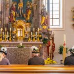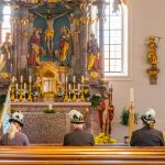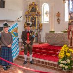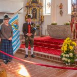 Die Gebirgsschützenkompanie Wössen Achental folgte dem weiteren Aufruf ihres Landeshauptmanns und präsentierte nach Absprache mit der Pfarrei am Sonntag ihre Kompaniefahne vor dem Altar der Pfarrkirche St. Martin. Mit einer kleinen Abordnung aus Kompaniehauptmann Georg Haslberger (von rechts), Marketenderin Maria Haslberger und Fähnrich Andreas Gerke brachten sie kurz vor 10 Uhr die Kompaniefahne in die Pfarrkirche. Die drei pflegten ein stilles Gedenken, um für die hiesigen Gebirgsschützen die besondere Verbindung zum Patronat der Muttergottes, zur Heimat, Tradition und dem Brauchtum zu belegen.
