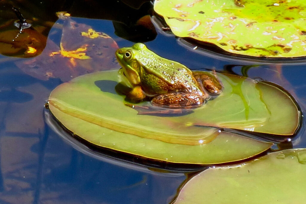 Im Buschwerk hört man zahlreiche Singvögel, z. B. verschiedene Meisenarten oder die Mönchsgrasmücke, über dem Wasser flitzen Mehl- und Rauchschwalben auf der Futtersuche, im Schilf turnen Rohrammer und Rohrsänger, im Schwimmblattbereich sitzt der Wasserfrosch, nisten Haubentaucher und Blässrallen und der Zwergtaucher lässt sein Getriller hören, im Wasser gründeln bzw. tauchen Stock-, Reiher-, Tafel- und Schnatterenten, am westlichen Ufer stehen Grau- und Silberreiher, Lachmöwen und Graugänse versammeln sich auf der Sandbank und der Kormoran trocknet seine Flügel.