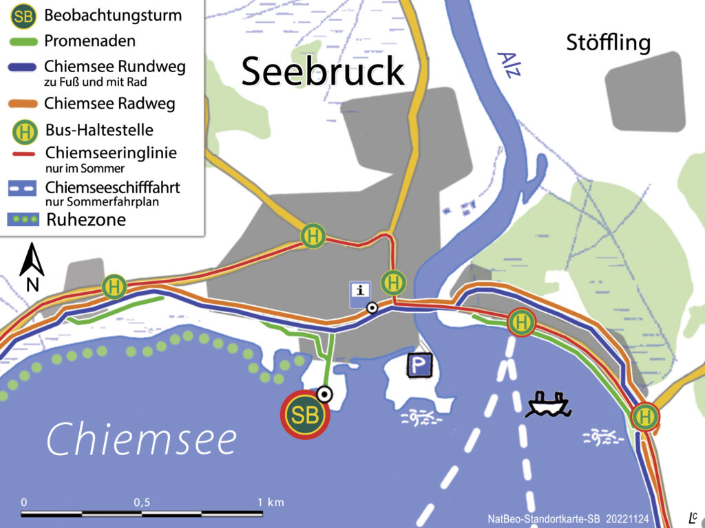 Der idyllisch im Kurpark von Seebruck gelegene Beobachtungsturm steht auf einer kleinen Halbinsel in der Nähe einer der größten ganzjährig geschützten Ruhezonen des Chiemsees mit großflächigem Schilfbestand.