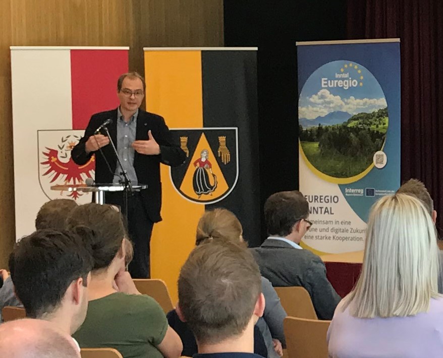Prof. Markus Mailer von der Universität Innsbruck bei seinem Fachvortrag „Was bedeutet die Verkehrswende für den ländlichen Raum?” vor ZuhörerInnen aus Bayern und Österreich im Veranstaltungszentrum Münster.