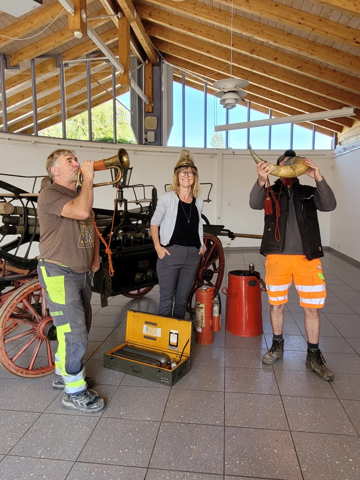 Sie testen die historischen Stücke auf ihre Tauglichkeit: Eggstätts Bauholleiter Sebastian Weber sen., die Leiterin der Tourist-Info Julia Hausmann und Bauhofmitarbeiter Sebastian Weber jun. (v.l.n.r.)