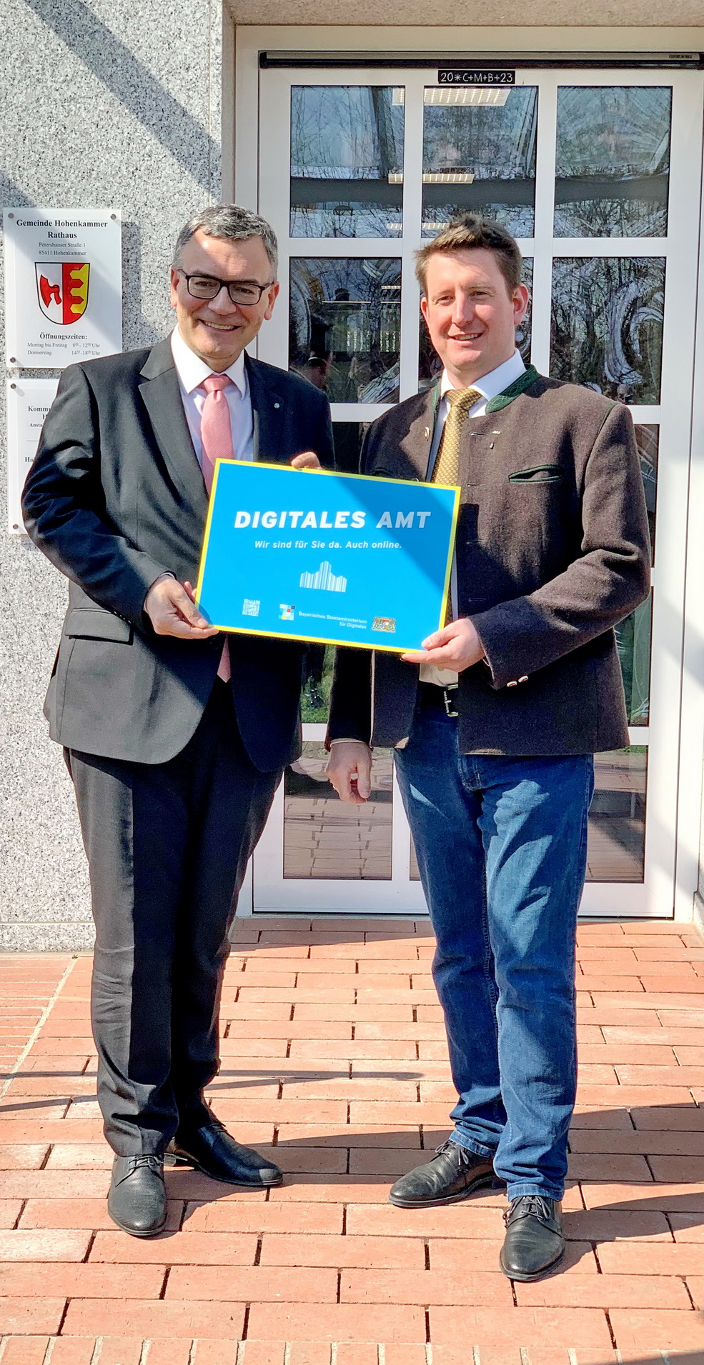 Die Gemeinde Hohenkammer wird „Digitales Amt“. Die Kommune erhielt heute die Auszeichnung vom Leiter der Staatskanzlei, Staatsminister Dr. Florian Herrmann. Als „Digitales Amt“ dürfen sich bayerische Kommunen bezeichnen, die mindestens 50 kommunale und zentrale Online-Verfahren im sogenannten BayernPortal verlinkt haben. Diese Kommunen werden zudem auf der Webseite des Staatsministeriums für Digitales veröffentlicht, um zu zeigen, welche Kommunen bei der Digitalisierung bereits gut vorangekommen sind.