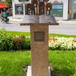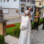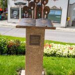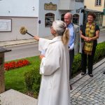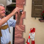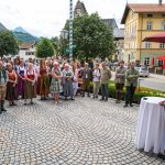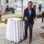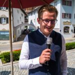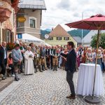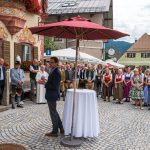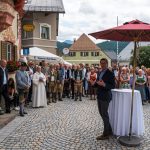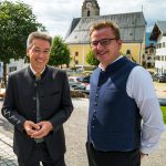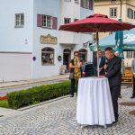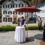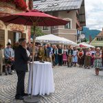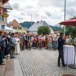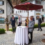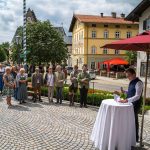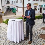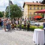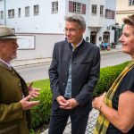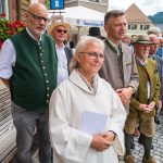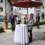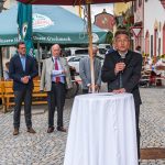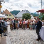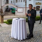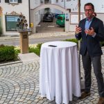All dies geschah durch den unermüdlichen Einsatz von Enoch von und zu Guttenberg, der neben seiner persönlichen Anstrengung auch viel Privatvermögen in das Projekt Chorgemeinschaft investierte und auch immer für die Anliegen in unserer Gemeinde ein offenes Ohr hatte, Räumlichkeiten zur Verfügung stellte und für die Bewohnerinnen und Bewohner einfach da war. Mit Enoch von und zu Guttenberg hat uns 2018 eine große Persönlichkeit verlassen, welche eine Lücke – nicht nur unter den Chormitgliedern – auch in der Gemeinde hinterließ. Auf Antrag von Altbürgermeister Jürgen Tremmel und unserem ehemaliger Bürgermeister Josef Trost hat unser Marktgemeinderat sich ziemlich genau ein Jahr nach dem Tod Guttenbergs dazu entschieden ihm ein Denkmal zu setzen. Der Standort wurde so gewählt, dass das Denkmal künftig ein Blickfang am Marktplatz ist und wurde hier direkt vor dem Schwirtlich-Haus platziert, in dem in den letzten Monaten auch noch etwas weiteres Besonderes erarbeitet wurde: Im Museum im 1. Obergeschoss haben ehemalige Mitglieder des Chors, vor allem Frau Eutermoser und Frau Dürbeck, viele Stunden investiert, um Enoch zu Guttenberg und der Chorgemeinschaft noch in anderer Weise zu gedenken. Es ist ein kleiner Museumsraum entstanden, welcher mit Konzertplakaten, Hörbeispielen, Ausstellungsstücken uvm. die Chorgemeinschaft und deren Dirigenten noch viele Jahrzehnte „greifbar“ in Erinnerung halten soll. Sie alle werden am heutigen Tag die Gelegenheit haben auch die Ausstellung zu besuchen.”