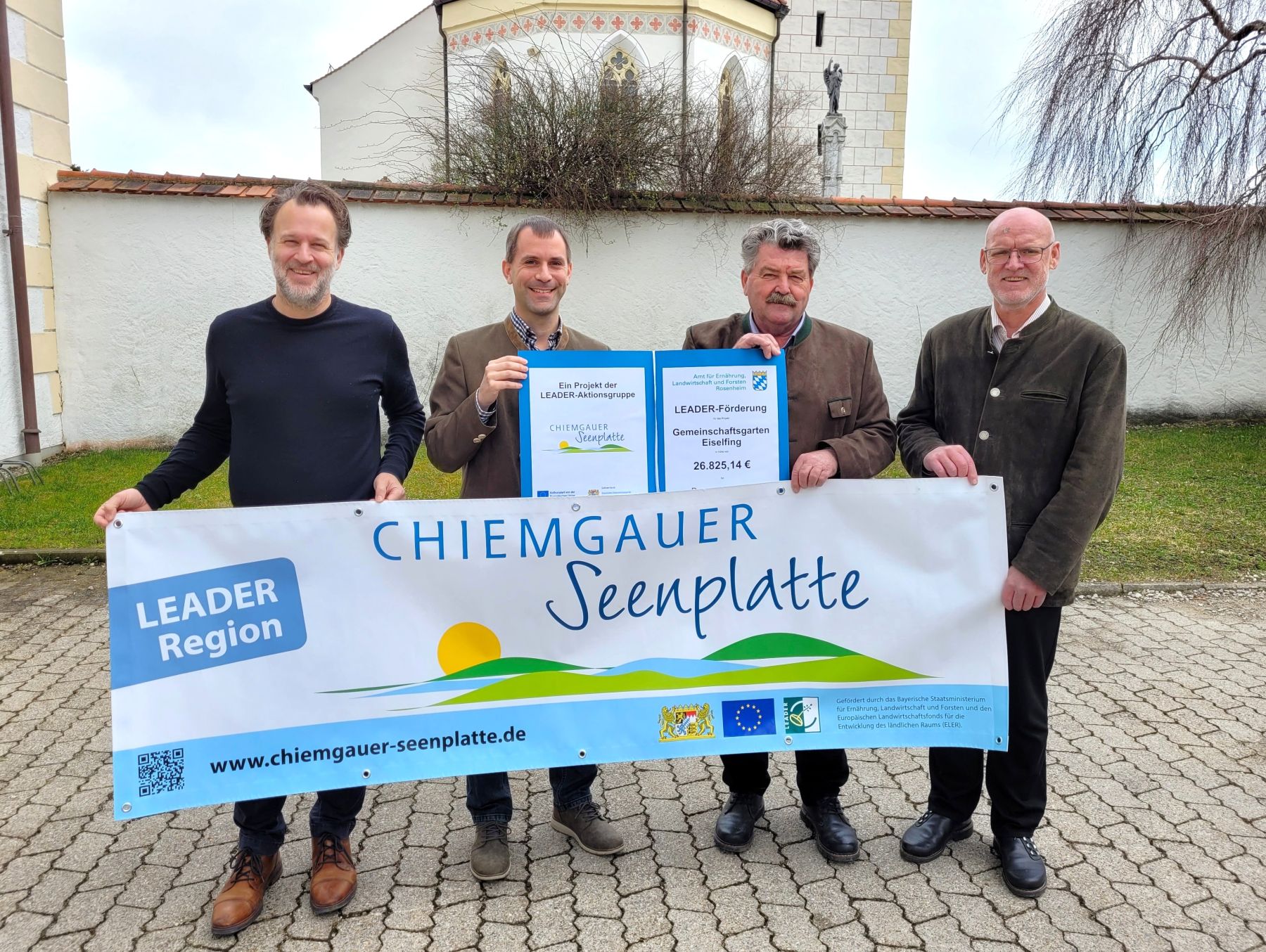 Von links: Christian Fechter (LAG-Manager), Bürgermeister Georg Reinthaler, Sepp Reithmeier (LAG-Vorsitzender) und Johann Kölbl (Amt für Ernährung, Landwirtschaft und Forsten) bei der Übergabe des Förderbescheids in Eiselfing.