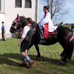 Alle Jahre am Ostermontag findet in Traunstein die überaus farbenprächtige Pferdewallfahrt verbunden mit dem Schwertertanz statt. Bei sommerlicher Temperatur und einer leichten Prise zogen traditionell historische Gruppen in mittelalterlichem Gewand und prächtig aufgeputzten Rössern und Kutschen zu Ehren des Heiligen Georg, Schutzpatron der Pferde, durch Traunstein bergan zum Ettdorfer Kircherl, wo die Gruppen, Pferde und Reiter gesegnet wurden. Verbunden mit dem Georgi – Ritt ist in der schönen Stadt Traunstein jeweils 10 Uhr vormittag und nachmittag um 14 Uhr der Schwertertanz. Er stellt die Vertreibung des Winters dar.