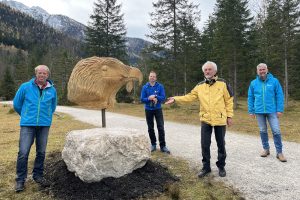 Ein neuer, holzgeschnitzter Bartgeierkopf schmückt ab sofort den Steinadler-Beobachtungspunkt im Klausbachtal. Die Skulptur ist ein Geschenk des Vereins der Freunde des Nationalparks e.V. an den Nationalpark und seine Besucher.