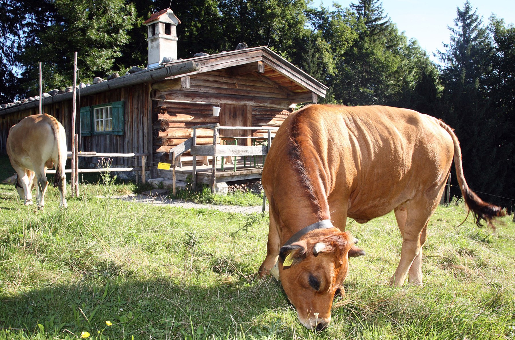 Die einst in der Region rund um die Glentleiten weit verbreiteten Murnau-Werdenfelser Rinder weiden im Sommer auf der Alm der Glentleiten. Bildquelle: Bezirk Oberbayern, Archiv FLM Glentleiten, Foto: Nixdorf