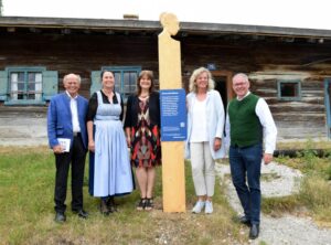 Vor einer der Stelen im Museumsgelände freuen sich über die Ausstellung Bezirkstagspräsident Josef Mederer, Maria Lidl (stellvertretende Kreisbäuerin WM/Vorstandsmitglied im Bayerischen Bauernverband), Regine Wiesen (Referatsleiterin im BayStMELF), Museumsdirektorin Dr. Julia Schulte to Bühne und Museumsreferent des Bezirks Oberbayern Thomas Schwarzenberger. Bildquelle: Bezirk Oberbayern, Archiv FLM Glentleiten.