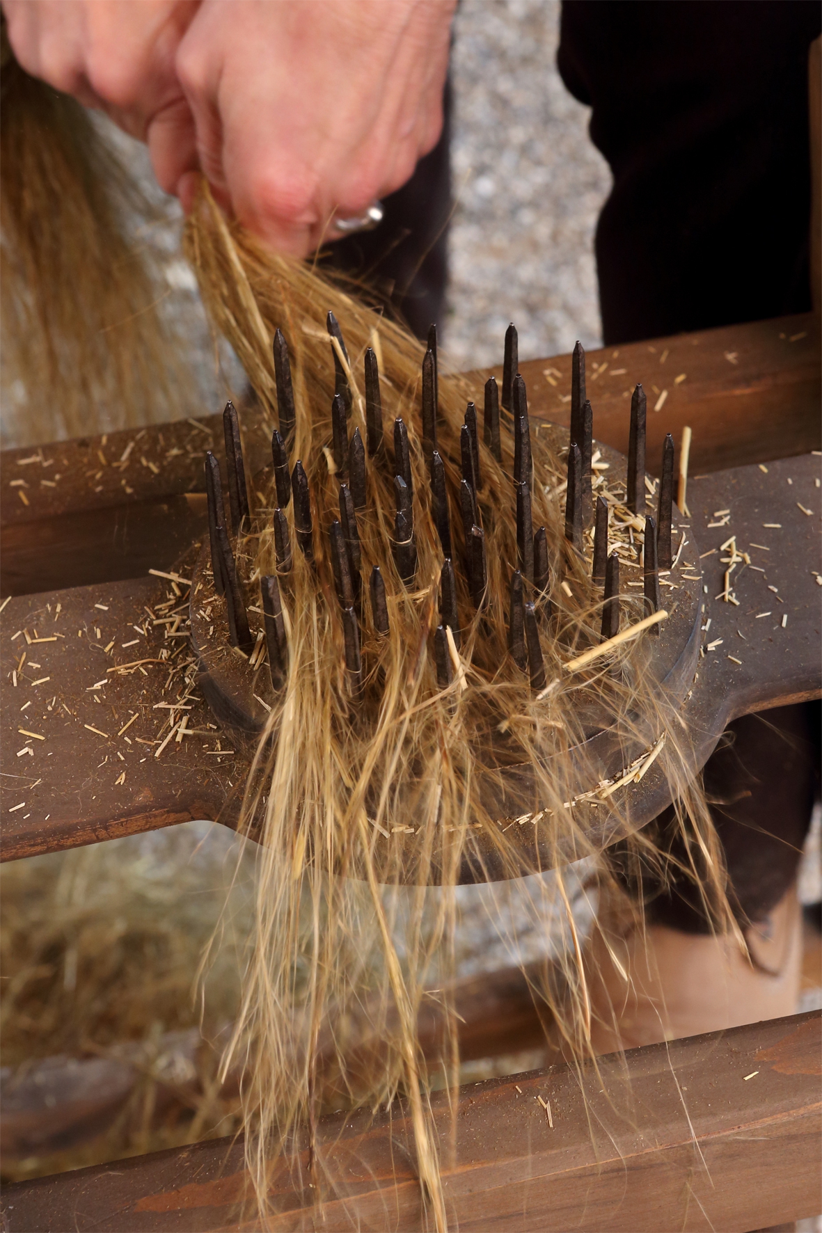 Das Hecheln kommt nach dem Riffeln, Brechen und Schwingen des Flachses. Dabei werden die Fasern durch eine Art Kamm gezogen, an dem grobe Teile hängen bleiben. Bildquelle: Bezirk Oberbayern, Archiv Freilichtmuseum Glentleiten, Foto: Nixdorf