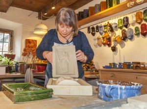 Doris Schickel, die Keramikmeisterin im Freilichtmuseum, zeigt während der Kachelofentage die Herstellung von Ofenkacheln in der Glentleitner Hafnerei. Bildquelle: Bezirk Oberbayern, Archiv FLM Glentleiten, Foto: Bäck.