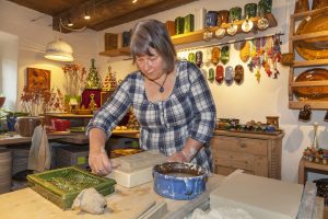 Keramikmeisterin Doris Schickel zeigt während der Kachelofentage in der Glentleitner Hafnerei, wie Ofenkacheln handwerklich entstehen. Bildquelle: Bezirk Oberbayern, Archiv FLM Glentleiten, Foto: Bäck.