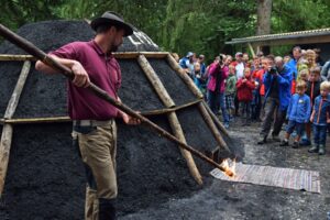 Bald qualmt der Kohlenmeiler wieder und verbreitet an der Glentleiten seinen unverwechselbaren Duft. Das Entzünden erfolgt beim Köhlerfest am 4. August. Bildquelle: Bezirk Oberbayern, Archiv FLM Glentleiten, Foto: Röttinger