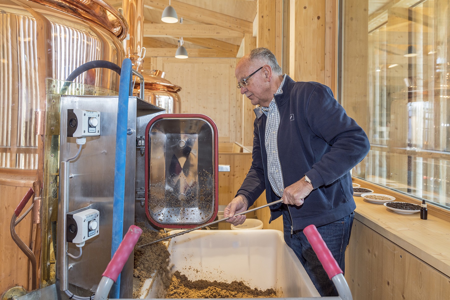 Bezirkstagspräsident bei der Arbeit: Nach dem eigentlichen Brauvorgang bleibt im Läuterbottich Treber zurück. Josef Mederer räumt den Bottich aus. Bildquelle: Bezirk Oberbayern, Archiv FLM Glentleiten, Foto: Bäck.