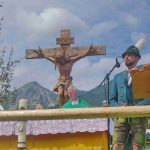 Pfarrer Martin Strasser vom Pfarrverband Oberes Achental, der den Gottesdienst mit Diakon Erik Oberhorner zelebrierte, lobte die Trachtler ob ihres Kommens bereits am Morgen in so großer Zahl und sagte: „Das Leben und das Dasein ist eine Durchreise und ein Unterwegssein. Auf dem Weg gilt es die Schöpfung, die Natur, die Pflanzen, die Tiere und die Menschen zu achten und zu beachten“. In diesem Sinne nahm der Geistliche, der in seiner Kindheit aktiver Trachtenbua in Rottau war, die Ziehharmonika zur Hand und stimmt zum Lobgesang auf die Seele den dann gemeinsam gesungenen Andachtsjodler an.
