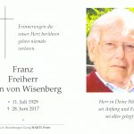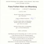 Im Alter von fast 88 Jahren ist Franz Freiherr Klein von Wisenberg aus Prien verstorben. Bei der Trauerfeier in der Pfarrkirche „Maria Himmelfahrt“ in Prien erinnert Kaplan Joshy daran, dass Klein von Wisenberg als einer von drei Brüdern in Brünn zur Welt und 1942 ins Internat nach Schondorf am Ammersee kam. Als junger Bursche musste er noch zur Wehrmacht und er kam im März 1945 als Flakhelfer nach Dresden. Nach der Gefangenschaft und nach der Flucht aus seiner Heimat Tschechien besuchte er die Hotelfachschule in Bad Gastein und arbeitete in verschiedenen Hotels ehe er eine berufliche Karriere bei Hapag Lloyd antrat. Nach der Hochzeit mit Renate Freifrau Klein von Wisenberg eröffnete er in Prien im Jahr 1979 ein Reisebüro, das das Ehepaar bis zum Rentenbeginn im Jahr 1994 gemeinsam führte. Dabei arbeitete das Reisebüro sehr aktiv mit dem örtlichen Verkehrsamt sowie mit den privaten und gewerblichen Vermietern zusammen. Der Versuch von Herrn von Wisenberg nach der Wende in Tschechien das Familienschloss Wisenberg wieder zurückzuerlangen gelang trotz vieler Anstrengungen nicht. Im Beisein des Geistlichen aus Wisenberg wurde Franz Freiherr Klein von Wisenberg auf dem Priener Friedhof zur letzten Ruhe geleitet.