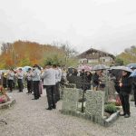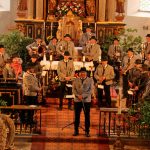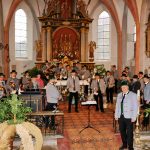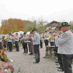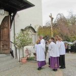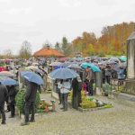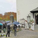 Nach dem Festgottesdienst zu Allerheilligen in der Pfarrkirche zeichnete es sich bereits ab, am Nachmittag zum Gräberumgang wird es regnen. So war es dann auch. Die Andacht zu Allerheiligen gestalteten Gemeindeassistentin Jacqueline Egold, sie wurde vor wenigen Wochen in ihr Amt eingeführt und Gundula Langer -Kochinke gemeinsam. Die Andachtsfeier fand im Freien im Vorbereich des Leichenhaus statt. Der einsetzende Regen zwang die Musikanten dann im Altarraum der Kirche Aufstellug zu nehmen. Sie begleiteten die Andachtsfeier. Einige wenige Kirchgänger suchten ebenfalls Schutz im Kirchenraum. Unter den schützenden Schirmen fanden sich viele Gläubige an den Gräber ihrer Angehörigen ein. Der Altardienst segnete mit Weihwasser und Weihrauch die Grabstätten. Die Musikanten spielten zum Abschluß der Andachtsfeier im Kriegerdenkmal das Lied vom Guten Kameraden