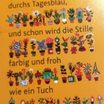 Bis zum Sonntag, 6. April, dauert die Ausstellung im k1/Kultur- und Veranstaltungszentrum in Traunreut, Munastraße 1 „Blumen spazieren durchs Tagesblau“, eine Wanderausstellung der internationalen Jugendbibliothek München. Es werden Kindergedichte mit tollen Illustrationen gezeigt, wobei namhafte Übersetzer auch ausländische Gedichte ins Deutsche übertragen. Jeweils erscheint das Gedicht aber auch in seiner Originalsprache und die Illustration, aus dem Buch, aus dem das Kindergedicht übernommen wurde. Die Gedichte sind wortgewandt, vermitteln die Lust an Klang, Rhythmus und Sprachbildern, was in Deutschland so ist wie in Japan, Tschechien oder Kanada. Die Ausstellung kann dienstags bis freitags von 11 bis 15 Uhr kostenlos besichtigt werden.