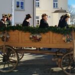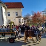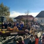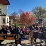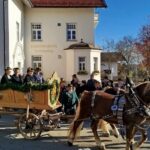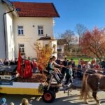 Traditionell immer am 6. November, dem Tag des hl. Leonhard, findet in dem schmucken Dorf Greimharting der Leonhardiritt statt. Und gerne haben wir vom Trachtenverein Griesstätt wieder daran teilgenommen, ist der dortige Trachtenverein „Ratzingerhöh“ doch unser Patenverein und so pflegen wir schon eine lange, freundschaftliche Beziehung zu den Greimhartingern. Mehr und mehr verzog sich der kalte Nebel und in Greimharting kam dann der blaue Himmel und die wärmende Sonne zum Vorschein. Seit über 600 Jahren gibt es in Greimharting diesen Leonhardiritt und wie es sich gehört, begann dieser für die Greimhartinger ganz besondere Tag um 9 Uhr mit einem Gottesdienst. In seiner Predigt erinnerte Pfarrer Philipp Werner an den Heiligen Leonhard. „Der Heilige Leonhard ist gerade mit seinen Attributen Gefangenschaft und Ketten ein Sinnbild auch in heutiger Zeit, wenn wir bedenken, dass wir uns von Egoismus, Sucht oder unguten Gewohnheiten befreien wollen“. Nach dem Gottesdienst in der Kirche gings dreimal am Pfarrer vorbei, der am Kirchenhügel die Segnung aller am Umritt beteiligten vornahm. Rund 90 festlich herausgeputzte Rösser, stolze Reiter und prächtige Motiv- und Leutewagen haben teilgenommen und gaben ein wunderschönes Bild auch für die vielen Zuschauer ab. Heilige, voran die Gottesmutter Maria mit dem ausgebreiteten Schutzmantel sowie der hl. Florian, der hl. Isidor, der hl. Ambrosius, der hl. Wendelin, des Weiteren Kirchen und Kapellen und landwirtschaftliche Symbole prägten diese Festwägen. Hier waren auch unsere feschen Griesstätter Röckefrauen dabei, wieder mit dem schön bemalten Motivwagen, gezogen von zwei prächtigen Rössern.