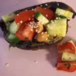 Avocadohälften mit je 1 El Tomaten-Gurkensalat füllen, Kircherbsen darauf verteilen und mit Sesam bestreuen.
