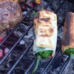 Teigblätter mit dem Olivenöl bestreichen und mit wenig Salz bestreuen, in Streifen schneiden die Paprikas damit umwickeln. Auf dem heißen Grill rund 5 – 6 Minuten grillen.