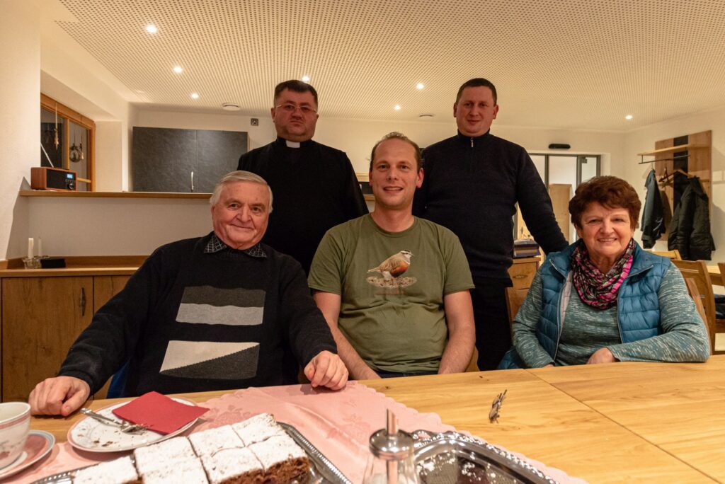 Macht seine naturwissenschaftliche Formelsammlung zu Spendengeld: Der Priener Mathematiklehrer Johannes Almer (vorne mitte). Über sage und schreibe zehntausend Euro freuten sich nicht nur Fritz Tischner und Katharina Schmid vom Helferkreis für die Diözese Ternopil sondern auch Pfarrer Voldymir Firman (links) und Pfarrer Varsyl Shafran von der Diözese. Sie können mit der Spende die dortige Schulspeisung unterstützen und bekommen zudem ein Stromaggregat.