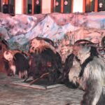 Ein weiterer Höhepunkt am Abend für die Kleinen aber eher noch für die Jugendlichen und Erwachsenen war der der Auftritt der Geigelstoa Pass. Auf dem Schulhof herrschte diffuses Licht bei den dichtgedrängt stehenden vielen Zuschauern, bis von weitem schon das Rasseln der Kuhglocken zu hören war und die Geigelstoa Pass auf den Hof stürmte. Stolz zogen sie einen Wagen mit einem Käfig, in dem ein weißer Engel eingesperrt war. Die Krampein gebärdeten sich wie wild zu lauter Musik auf dem Platz und rannten immer wieder auch auf das Publikum zu, um mit ihren Ruten kleine Schläge zu verteilen. Drei weitere Engel mit ihren großen weißen Flügeln schlichen sich auf den Platz, um ihren vierten eingesperrten Engel zu befreien. Die wilden Krampein stürzten sich sofort auf die Engel, bis der alte Bandenführer dem Treiben Einhalt gebot. Als dann der Heilige Nikolaus auf den Platz schritt wurden auch die Krampein ganz kleinlaut, befreiten den eingesperrten Engel und duckten sich demütig vor dem Heiligen Mann, der jetzt mit seinen wunderschönen vier Engeln wieder komplett war.