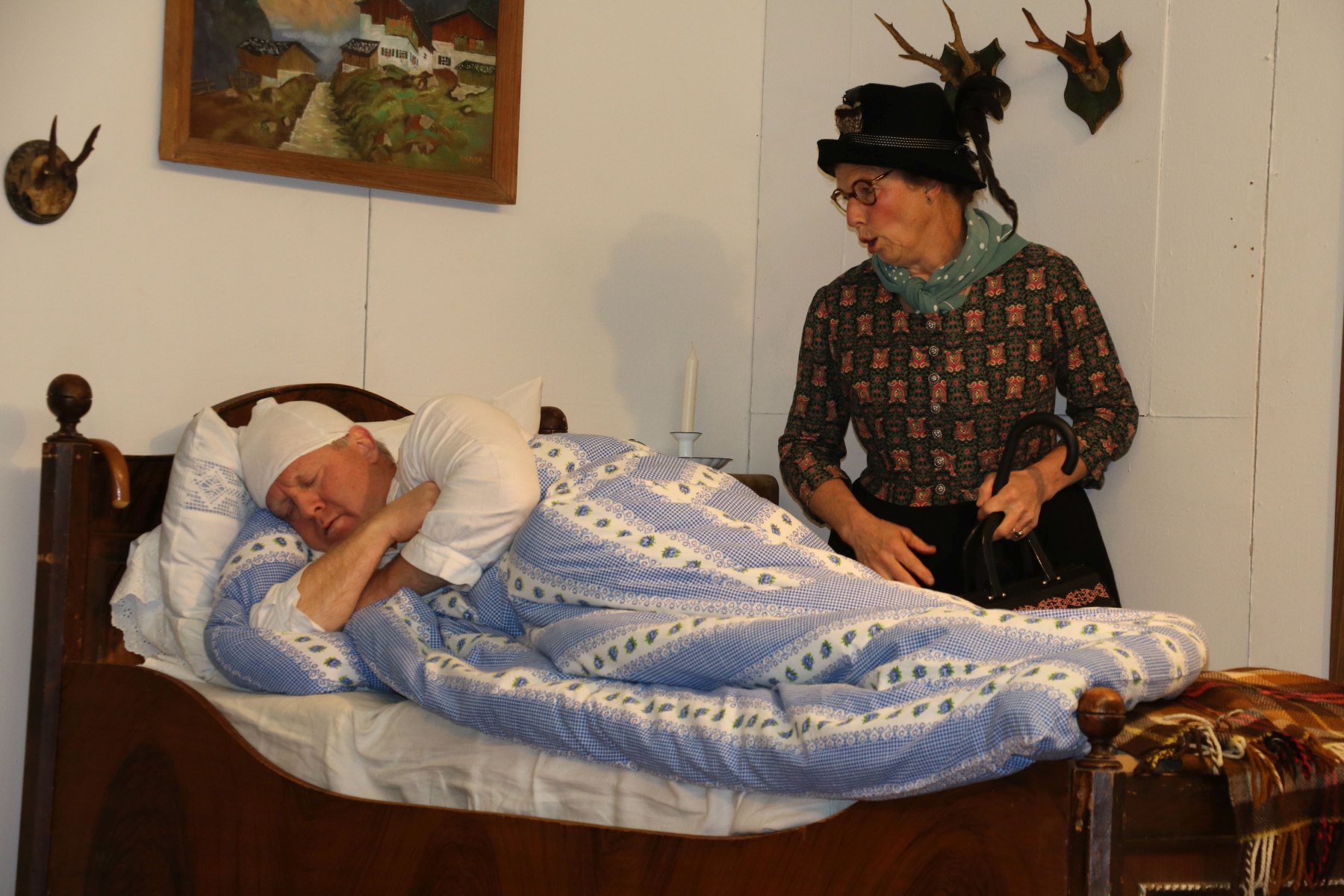 Burgi (Rita Stoib) macht einen Krankenbesuch beim Gschwendlhofbauer (Lambert Huber)