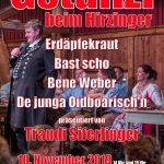 Brauchen Sie noch ein Weihnachtsgeschenk? Wäre vielleicht das Gstanzlsänger-Treffen mit Traudi Siferlinger am 10. November 2019 beim Hirzinger eine Idee? Karten gibt es beim Gasthof direkt, Telefon 08036-1266 oder email: info@hierzinger.eu oder im Ticketzentrum L. Kroiss, Tel. 08031-15001.