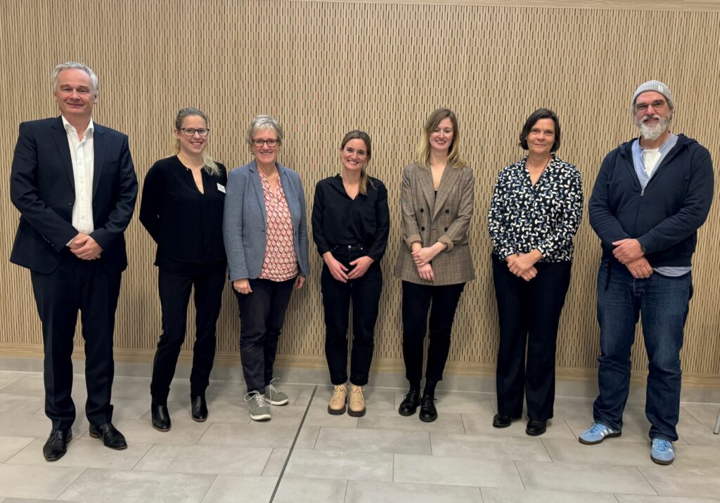 v. l. Chefarzt Privatdozent Dr. Andreas Schnelzer, Oberärztin Dr. Monika Wolf und Elisabeth Jordan, MammaCare Trainerin  und Breast Care Nurse von der RoMed Klinik für Gynäkologie und Geburtshilfe, Dr. Isabel Kellermann, Gynäkologische Tumorgenetik, Klinik für Gynäkologie und Geburtshilfe, Dr. Svenja Pfeifer, Fachärztin für Strahlentherapie RoMed MVZ, Maria Langer, Frauenselbsthilfe Krebs Bundesverband Rosenheim, Dipl. Sozialpädagoge Andreas Schüll, Leiter Psychosoziale Krebsberatungsstelle der Bayerischen Krebsgesellschaft Rosenheim.