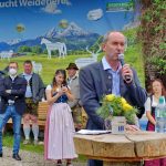 Hauptredner bei der ersten Almstation waren Bayerns stellvertretender Ministerpräsident Hubert Aiwanger und die Bayerische Staatsministerin für Ernährung, Landwirtschaft und Forsten. Wirtschafts- und Tourismusminister Hubert Aiwanger begann sein Grußwort wie folgt: „Ohne die Almbauern stünden wir heute auf einem Geröllfeld oder in einer geschlossenen Fichtenwaldung, den Bauern haben wir die Artenvielfalt von heute zu verdanken. Den vielen Generationen von Almbauern haben wir es zudem zu verdanken, dass sie in Jahrhunderten eine solche Bilderbuchidylle und damit Perlen für den Tourismus geschaffen haben. Leider werden die Bauern immer weniger, damit schwindet auch ihr Einfluss auf die Politik“. Aiwanger forderte eine Kosten-Nutzen-Debatte, wenn es um den Milchpreis geht und eine Balance wenn es um Tierwohl, Wald und Wild geht und sagte zum Sorgenthema Wolf: „Entweder Bergweide und Weidehaltung oder Wolf. Der Wolf hat andere Lebensräume, er ist keine heilige Kuh und gehört über das Jagdrecht gemanagt“. Abschließend meinte Aiwanger: „Der Bergbauer gehört geschützt und die Politiker sollten ihn in ihren Schutzkatalog aufnehmen“. Vor der Übergabe des Mikrofons an Landwirtschaftsministerin Michaela Kaniber bat AVO-Vorsitzender Glatz Hubert Aiwanger in dieser Angelegenheit doch einmal mit seinem Kabinettskollegen und Umweltminister Thorsten Glauber ein ernstes Wort zu reden, denn die vom AVO vor 15 Jahren aufgestellten Richtlinien mit Blick auf Weideschutz sind heute aktueller denn je.