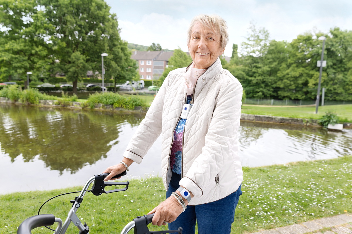 Eine Frau geht mit ihrem Rollator um einen Teich im Park spazieren. Zu sehen ist ein Mobilteil des Hausnotrufgeräts und ein Handsender am Handgelenk der Frau.