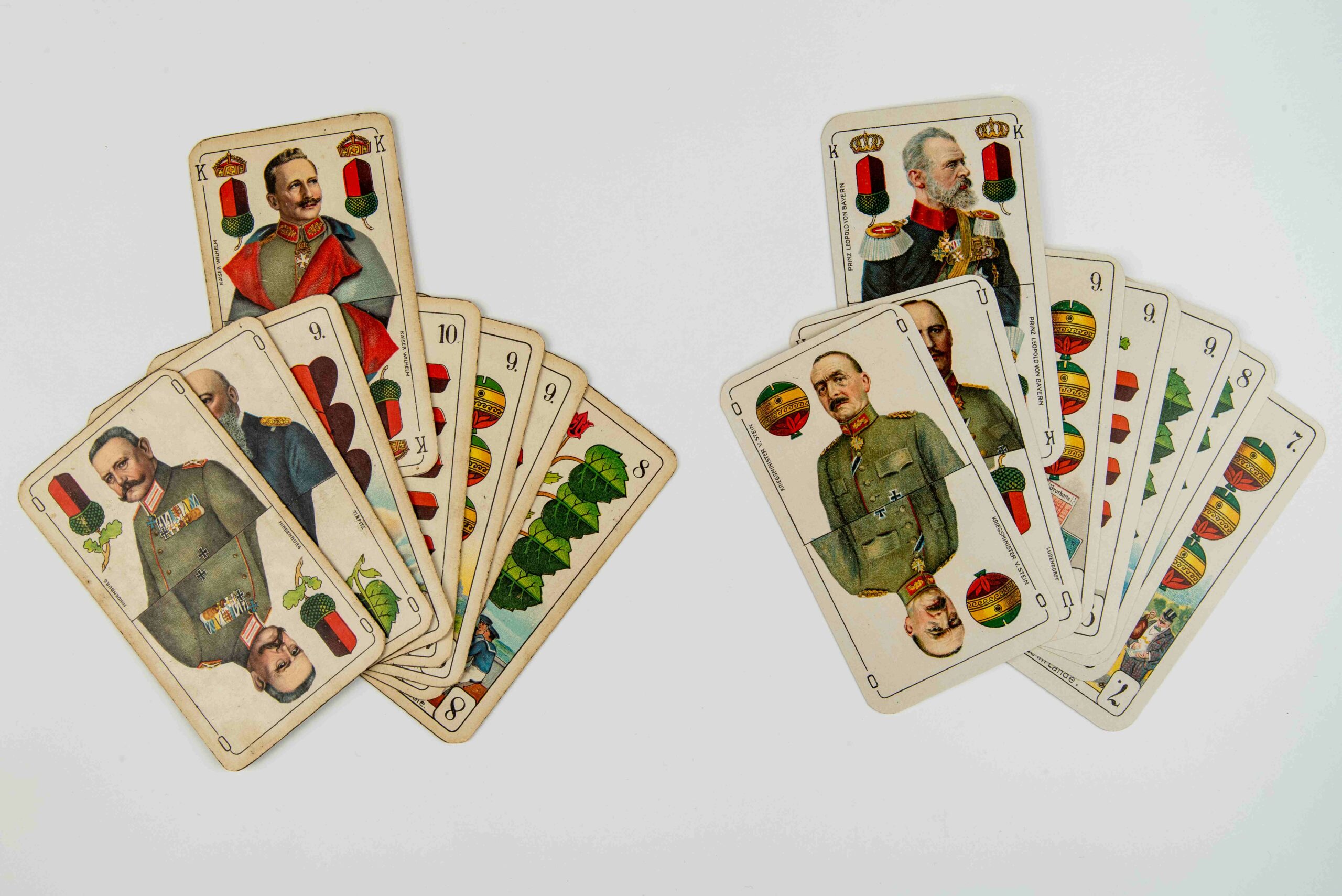 Bayern sticht Preußen: Deutsche Kriegsspielkarten mit Darstellung Prinz Leopolds von Bayern (rechts, 1918) statt Kaiser Wilhelm II. (links, 1915) © Haus der Bayerischen Geschichte