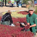 Es sind viele unterschiedlich farbige Heidepflanzen, die aus dem 40 Quadratmeter großen Beet am LAGA-Haupteingang einen herbstlichen Blütenteppich weben. Genau gesagt pflanzen Gärtner Matthias Ehrmann und sein Team an diesem Oktobertag 1200 Eriken und Gräser im Muster einer großen Zielscheibe in den Kreis. „Jetzt ist die perfekte Pflanzzeit für die Heidepflanzen, die den Herbst und den Winter über ein tolles Bild abgeben werden“, sagt Matthias Ehrmann.