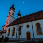 Im Rahmen des Festgottesdienstes mit dem Kirchenchor und Orchester wurde zudem die Kunstinstallation „Himmelsleiter“ am Nordturm der Kirche enthüllt und erstmals beleuchtet. Der Erzbischof von München und Freising besuchte damit eine der bedeutendsten und umfangreichsten Heilig-Grab-Darstellungen; sie war nach jahrzehntelanger Pause zuletzt vor drei Jahren aufgebaut. Das Heilige Grab von Aschau wird im Kirchenraum bis 24. April zu sehen sein, am Nordturm leuchtet die „Himmelsleiter“ bis 20. November. Das 28 Meter hohe Lichtobjekt, das der Gaißacher Künstler Erwin Wiegerling geschaffen hat, war bereits seit dem Jahr 2000 an vielen Orten in Deutschland zu sehen und wird nun erstmals im Landkreis Rosenheim gezeigt. Mit den zwölf Leitersprossen und sieben Engelsflügeln liegt dem Projekt die Vision des biblischen Jakob von der Himmelsleiter zugrunde: Jakobs Traum und der Aufstieg des Menschen zu Gott. Vorstellungen einer “Himmelsleiter” als Verbindung zwischen dem Göttlichen und dem Menschen fanden und finden sich in fast allen Religionen. Bei allen Unterschieden liegt ihnen stets das gleiche Anliegen zugrunde: ein Abstieg Gottes zu den Menschen oder einen Aufstieg des Menschen zu Gott.