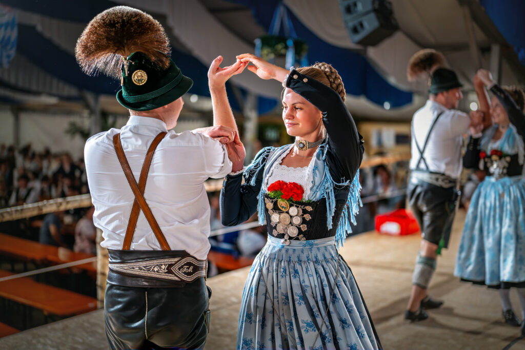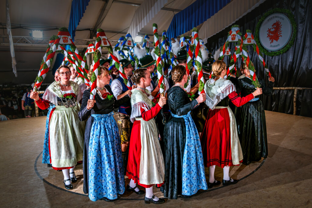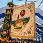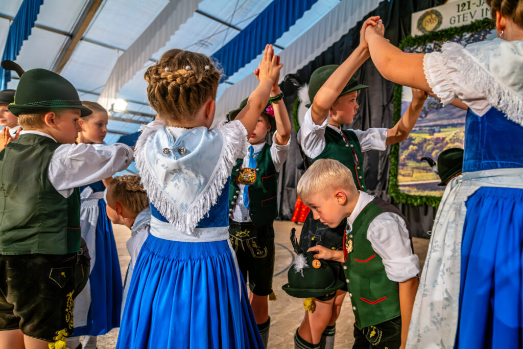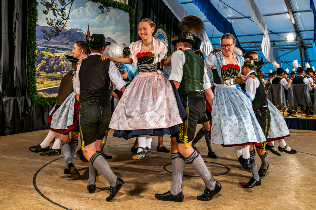 In diesem Sinne galt sein besonderer Willkommensgruß den Traditionsverbänden wie dem Bayernbund und den Bayerischen Gebirgsschützen, desweiteren den Abordnungen des Gauverbandes I, des Chiemgau-Alpenverbandes und des Rhein-Main-Gauverbandes120 aktive Dirndl und Buam aus einem Verein mit 580 Mitgliedern