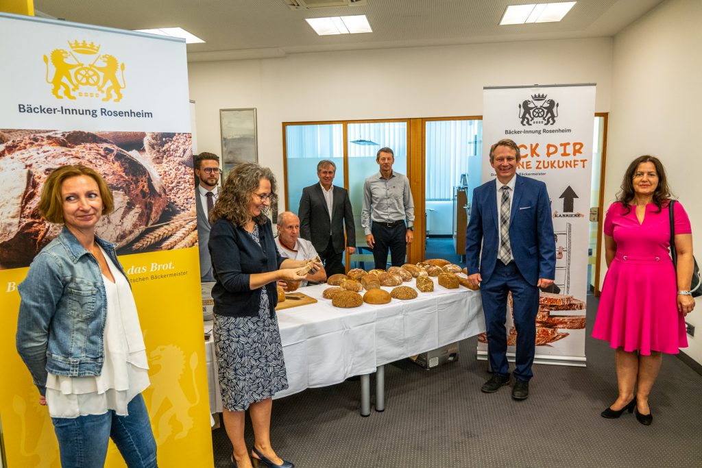 v. links: Marijana Berndanner Geschäftsführung der Kreishandwerkerschaft Christina Pfaffinger Ciemsee Alpenland Tourismusverband/ REGRo 2. Vorsitzende. Andreas Präg GS Leiter Kufsteinerstraße meine Volksbank Raiffeisenbank Manfred Stiefel Brotprüfer Wolfgang Sattlberger Obermeister der Bäckerinnung Rosenheim Rudolf Schiller Kreishandwerksmeister Christian Bürger Agrardirektor meine Volksbank Raiffeisenbank Elisabeth Widauer Geschäftsführung der ” Nimm’s RegRonal” Verkaufs GmbH