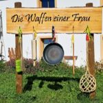So zum Beispiel bei den mitnehmbaren „Geduldsfäden“ in verschiedenen Längen und aus unterschiedlichen Materialien. Besonders nahegehend – zumindest für Männer – ist eine kleine Ausstellung zu den „Waffen einer Frau“. Die dabei angebrachten Haushaltsgeräte lassen gerade Männer anraten, sich vom Nachbarsstand einen Geduldsfaden mitzunehmen.