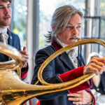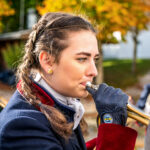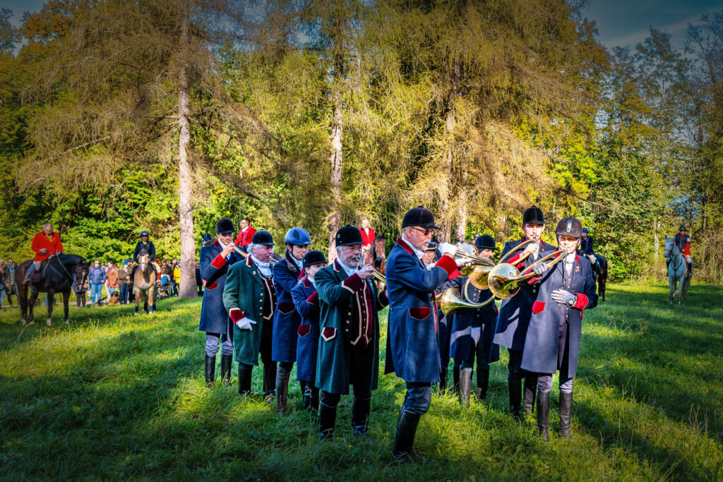 Als die klassischen Hornsignale der Chiemgauer Jagdhornbläser “Bien Aller de Baviere” und ihrer Jungbläsern, den Bayerischen Jungwölfen, „Les Louvarts de Baviere“ riefen, formieren sich alle Reiter um zum großen Stelldichein mit der Hundemeute vor der Kapelle des Alten Schlosses.