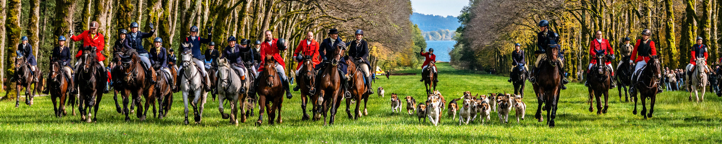 Als die klassischen Hornsignale der Chiemgauer Jagdhornbläser “Bien Aller de Baviere” und ihrer Jungbläsern, den Bayerischen Jungwölfen, „Les Louvarts de Baviere“ riefen, formieren sich alle Reiter um zum großen Stelldichein mit der Hundemeute vor der Kapelle des Alten Schlosses.