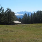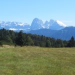 Also hinauf geht´s auf die Villanderer Alm. Man kann bis auf 1750 m bis zum gebührenpflichtigen Parkplatz unterhalb der Gasserhütte mit dem Auto hinauffahren. Der große Parkplatz ist fast voll, es gibt viele deutsche Autonummern. Zahlreiche Wanderwege gehen von hier zu den verschiedensten Zielen, mehr oder weniger anstrengend, geeignet auch für Kinder und ohne alle Gefahr. Wir wandern auf dem Großen Rinderplatz-Rundweg, von dem aus wir immer wieder beneidenswerte Ausblicke haben. Der Blick schweift über Almen mit ausgedehnten Weideflächen und riesigen Latschenfeldern über die umliegenden Berggipfel wie den Villanderer Berg bis hinaus in die Dolomiten, von der Plose über den Peitlerkofel, Kreuzkofelgruppe, Geislergruppe, Seceda, Sella, Lang- und Plattkofel, Rosengarten bis zur Seiser Alm und zum Schlern. Bis zu einer Bank an der “Rinderplatz-Aussicht” ist unser Wanderweg recht gemütlich, dann wird er in einem Waldstück schmal und etwas holprig. Es geht ein wenig rauf und runter bevor wir den Rinderplatz erreichen. Wir kommen zur phantastisch gelegenen Rinderplatz-Hütte, auf deren Sonnenterrasse kein Tisch mehr frei ist, obwohl wir unterwegs nur wenige Wanderer getroffen haben. Auf der ausgedehnte Almfläche verlaufen sich die Wanderer.