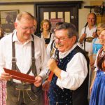 Im Laufe des Abends gab es noch Ehrungen für zwei langjährige Mitglieder des Volkstanzkreises, Monika Wiesholzer (40 Jahre) und Franz Rupprecht (25 Jahre). Beide waren beim Ehrenabend des Vereins im Sommer verhindert und konnten jetzt die Ehrenurkunden sowie eine kleine Aufmerksamkeit in Empfang nehmen. Wenig später bildeten die Tanzpaare einen großen Kreis für eine treue Besucherin, die an diesem Tag Geburtstag feierte, und die Kirnstoaner Tanzlmusi spielte ihr einen Ehrenwalzer. Viel zu schnell verging die Zeit und vielen Besuchern war es noch deutlich zu früh, als nach Mitternacht der Tanzlführer zur letzten Tanzrunde des Abends aufrief. Gern hätten sie sich von der pfundigen Musi noch länger aufspielen lassen. Die setzte dann mit einer letzten Zugabe musikalisch den Schlusspunkt unter eine Tanzsaison, die corona-bedingt deutlich kürzer war als normal. Mit dem gemeinsamen Lied „Kimmt schee hoamli die Nacht“ verabschiedeten sich der veranstaltende Rosenheimer Volkstanzkreis, die Musikanten der Kirnstoaner Tanzlmusi und die Volkstanzfreunde für heuer voneinander.