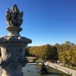 Auf die Idee, in den Wasserbassins direkt vor Schloss Herrenchiemsee Felskegel mit Skulpturen aufstellen zu lassen, kam der König, als er Fotografien vom Park des Königsschlosses La Granja de San Ildefonso bei Madrid mit ähnlichen gestalteten Brunnen sah (diese Residenz hatte sich ein Enkel Ludwigs XIV. im 18. Jahrhundert erbauen lassen): So steht im nördlichen Becken von Herrenchiemsee der Brunnen der geflügelten Ruhmesgöttin Fama, bei der Neid, Falschheit und Hass vom Felsen stürzen. Im südlichen Wasserbassin ist es die römische Glücks- und Schicksalsgöttin Fortuna, die auf der Spitze des Felsens auf einem Rad steht.
