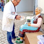 Fotos: Hötzelsperger – Eindrücke von der Priener Oma in der Bahnhofstraße und von den Reparaturarbeiten durch den Maler Paul Panzer. U.a. Oma mit Dirndl und Oma mit Altbürgermeister Klaus Daiber von Bernau