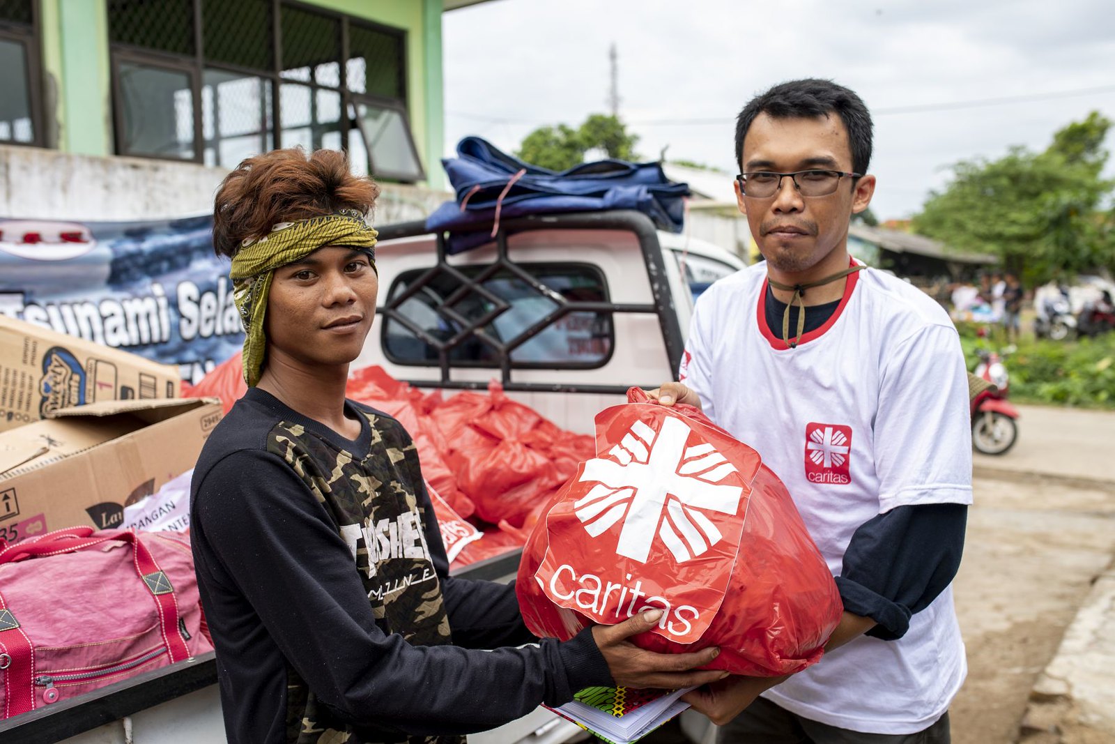 Java, Banten: In der Notunterkunft Labuan Teluk gibt ein Caritas-Mitarbeiter Lebensmittel und andere Hilfsgüter aus. In der Nacht zum 23. Dezember 2018 wurde Indonesien erneut von einem schweren Tsunami getroffen. Die Flutwelle traf die Inseln Sumatra und Java völlig unerwartet. Lokale Teams der Caritas sind mit Unterstützung von Caritas international im Einsatz, um Hilfe zu leisten. Im September 2018 wurde bereits die Insel Sulawesi von einem Erdbeben und einem Tsunami getroffen. mehr Informationen: https://www.caritas-international.de/hilfeweltweit/asien/indonesien/nothilfe-und-wiederaufbau-nach-tsunami Foto: Bente Stachowske Copyright Caritas international, Abdruck honorarfrei, Belegexemplar erbeten, Tel: 0761/ 200-288